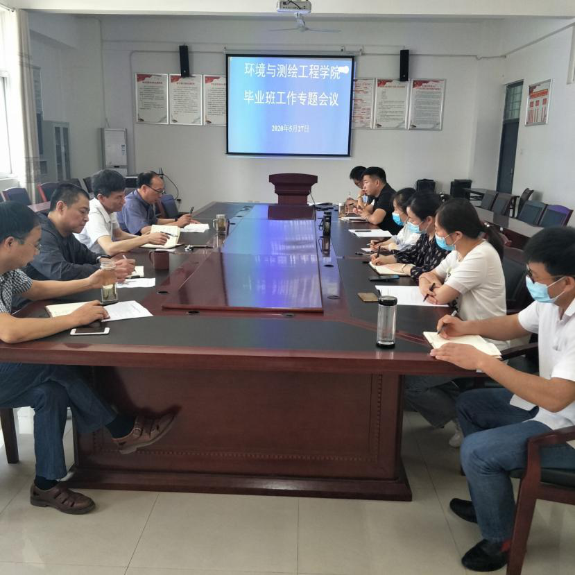 2020年5月27日上午,环测学院在工科类A315召开2020届毕业生工作专题会议,院长付金沐、党总支书记袁新田、副书记胡冰、学院科级干部、教研室主任以及毕业班辅导员参加会议,会议由付金沐主持。