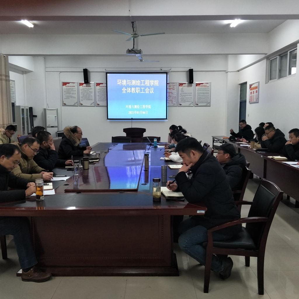 2021年1月6日下午,环测学院在工科楼A315召开期末工作会议,会议由付金沐院长主持,学院全体教职工参加会议。
