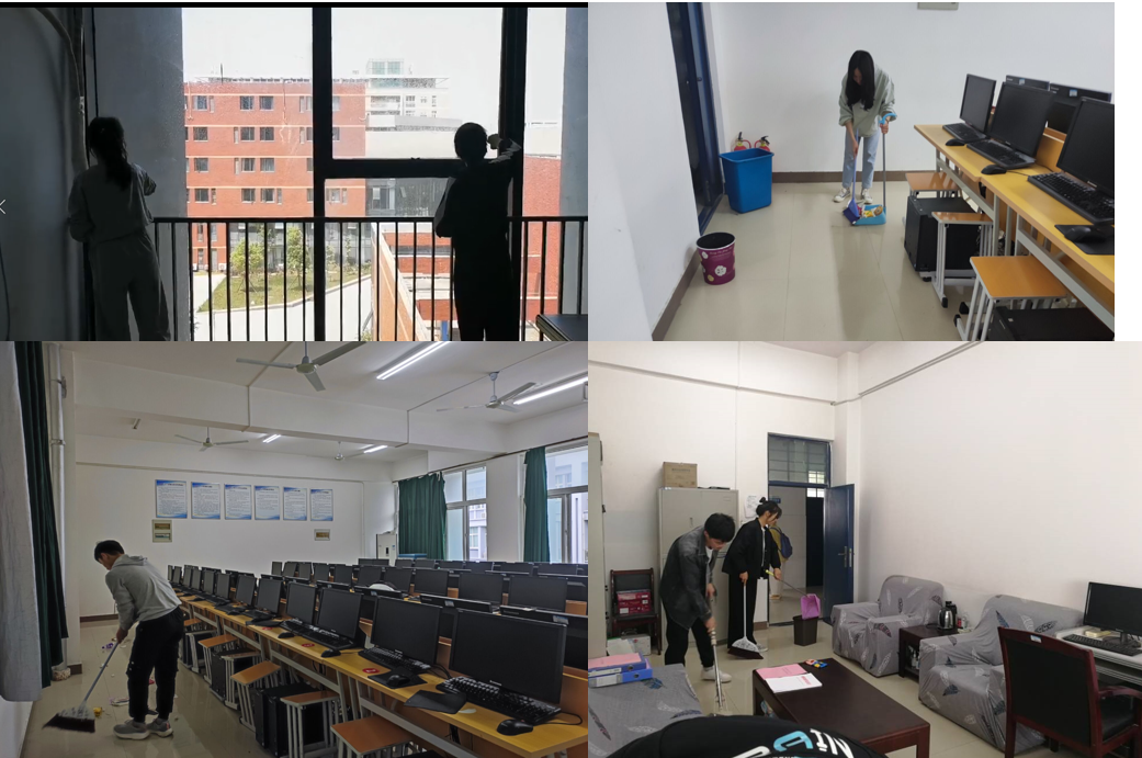 学院动员各班在校学生积极参与到集体劳动中,各班分工打扫教室、实验室、办公室等,锻炼了同学们合作劳动的集体意识。
