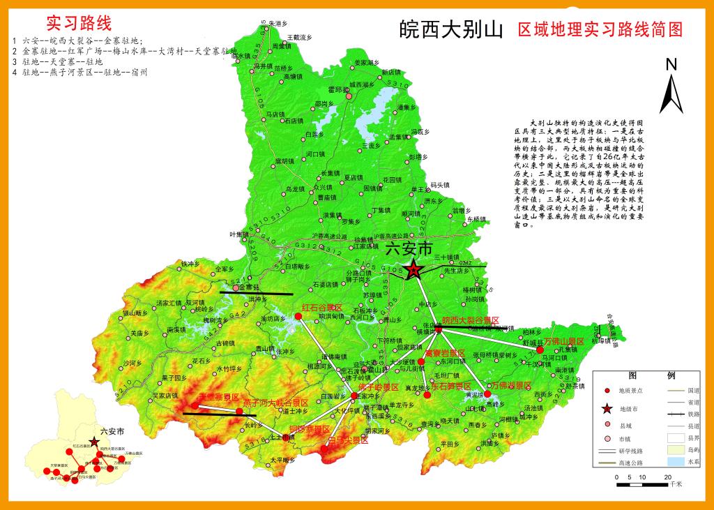 此次实习是由大别山区域自然地理与区域人文地理相结合的综合实习,实习样点分布在皖西大裂谷、天堂寨国家地质公园、燕子河天坑大峡谷、梅山水库等地,实习内容丰富,涵盖地质学、地貌学、气候学、水文学、植物地理、旅游地理、乡土地理、人文地理等学科知识。通过实习,让同学们身临其境去认知、去学习、去探究,领略了、学习了世界变质作用最深区域大别山的区域地理之美:时空隧道般穿越26.6亿年的原岩地质到1.3亿年岩浆侵入下的花岗岩大别山,直冲云霄般从山脚常绿阔叶林到天堂寨山顶山地草甸的垂直地带性的植被,从皖西大裂谷凤凰组的巨厚砾石沉积层的到燕子河天坑大峡谷出露的薄层大别杂岩,从沟蚀地貌到溶蚀峡谷,从荆楚大地到江淮流域,从黄棕壤到花岗岩成土母质......