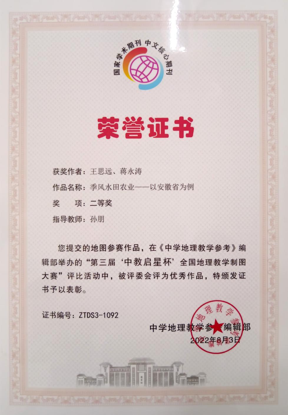 “中教启星杯”全国地理教学制图大赛是面向中高等学校教师和教育师范生的创新性比赛。由陕西师范大学出版总社《中学地理教学参考》编辑部主办、北京中教启星科技股份有限公司协办的第三届“中教启星杯”经5月1日—6月30日报名及作品提交、7月1日—30日评委评审,近日公布了获奖名单。环测学院2019级地理科学2班王思远同学设计的《季风水田农业—以安徽省为例》系列组图荣获本次大赛二等奖,指导老师孙朋副教授获“优秀指导教师奖”。