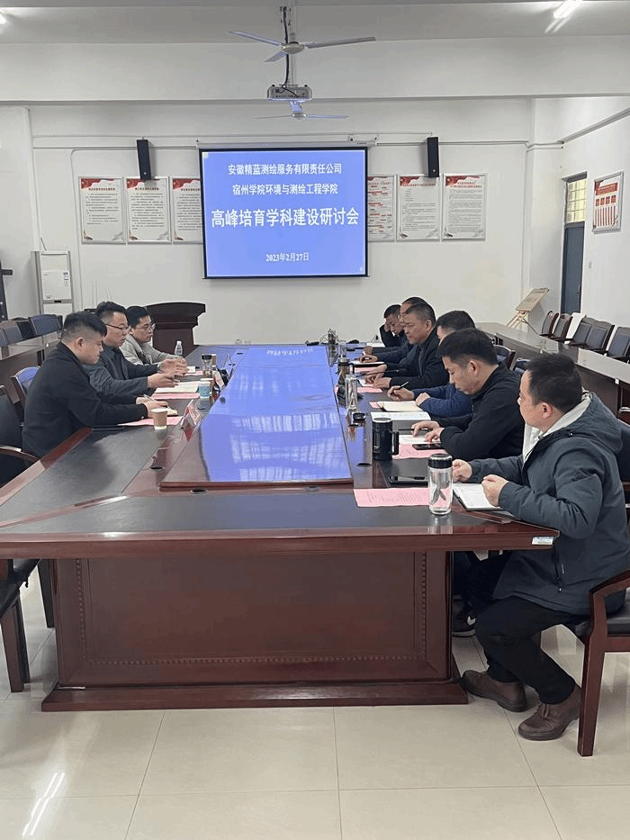 为加快推进高峰培育学科建设工作,2023年2月27日下午,安徽精蓝测绘服务有限责任公司和环境与测绘工程学院在工科楼A315召开高峰培育学科建设工作研讨会,会议由环境与测绘工程学院院长张海洋主持,安徽精蓝测绘服务有限责任公司总经理龚环环,地信院长李锦,市场专员李德园,环境与测绘工程学院党委书记胡冰,副院长徐国伟及学院相关科室负责人参加会议。