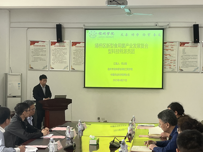 2023年4月21日上午,安徽省科技厅-宿州学院市级科技特派团建设工作座谈会于工科楼A315环境与测绘工程学院会议室召开。省科技厅农村科技处副处长马维海,农社中心综合办主任寇伟锋,宿州市埇桥区科技局副局长黄家军,宿州市科技局农社科副科长葛绍康,宿州学院党委副书记、院长、埇桥区新型食用菌产业发展复合型科技特派团团长李福华,环境与测绘工程学院院长张海洋,科研处副处长张冰秋,商学院副院长周书灵及科技特派团成员出席会议。张海洋主持会议。