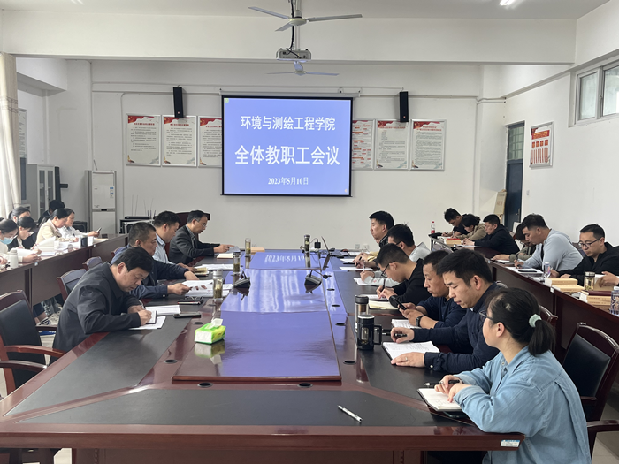 2023年5月10日下午,环测学院在工科楼A315召开全体教职工会议,学院党委书记胡冰,党委副书记、院长张海洋,党委副书记、纪委书记李建新,教学副院长徐国伟及全体教职工参加会议,会议由张海洋主持。