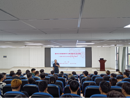 孙健在讲座中结合自己从教30年的经历,认为一名优秀的老师,除了具备扎实的知识储备以及教学基本技能以外,还应该具有高尚的道德情操及教育情怀;教育的目的在于完善学生的人格,教师是教育的主导者,直接肩负着培育下一代健康成长的历史重任。高尚的师德和良好的形象是每一个教师做好教育工作的先决条件,这是时代的要求,也是教师在教育岗位上取得成功的力量之所在。而具有教育情怀的人,一定能成为一名优秀的从教者。有情怀的教师,会琢磨着如何把教育教学中的每一件事情做好。教育情怀的有无,直接决定了教师的优秀与否。最后,他从师德养成、教师成长、教育情怀等三个方向上为大家做出要求与期盼,同时他也勉励同学们要学好专业知识和技能,不断磨练自己。