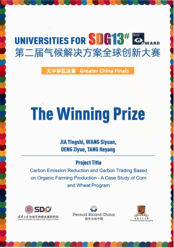 第二届气候解决方案全球创新大赛大中华区赛总计43支团队、181名同学报名参赛,涉及中国大陆、中国香港、中国台湾、英国、加拿大的69所高校。经过两轮评审,10支队伍晋级大中华区决赛。最终,环境与测绘工程学院19级地理科学2班王思远及其“农碳一体化建设小分队”、荣获大中华区优胜奖,她们的项目是基于有机农业生产的碳减排与碳交易,旨在调动农业进入碳市场,与工业进行碳抵消,从生产用品到耕作方式等多方面进行有机农业更新,帮助农民解决碳排放过高,污染大,传统农业获利低等问题。