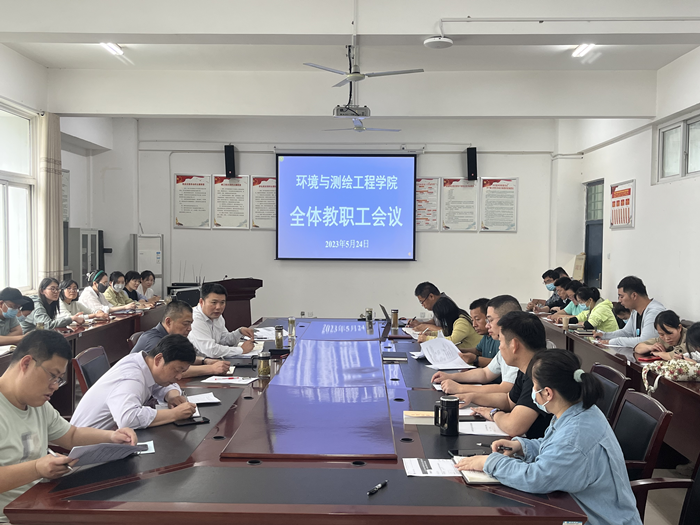 2023年5月24日下午,环测学院在工科楼A315召开全体教职工会议,学院党委书记胡冰,党委副书记、院长张海洋,党委副书记、纪委书记李建新,教学副院长徐国伟及全体教职工参加会议,会议由张海洋主持。