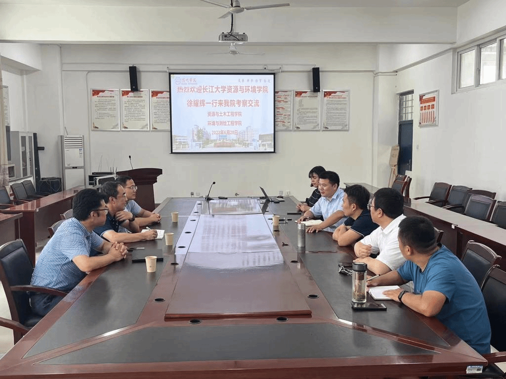 2023年6月28日下午,长江大学资源与环境学院院长徐耀辉一行3人到我校环境与测绘工程学院、资源与土木工程学院考察交流,环境与测绘工程学院党委副书记、院长张海洋,科研秘书李致春、地理与环境教研室主任刘娜,资源与土木工程学院院长陈松、科研副院长王明梁、科研秘书郭艳以及相关专业老师共13人参加考察交流会。会议在环境与测绘工程学院工科楼A315召开,由张海洋主持。