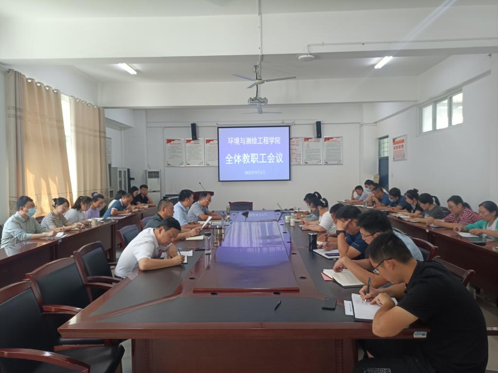 2023年9月1日下午,环境与测绘工程学院在工科楼A315召开全体教职工会议,学院党委书记胡冰,党委副书记、院长张海洋,党委副书记、纪委书记李建新,教学副院长徐国伟及全体教职工出席了会议,会议由张海洋主持。