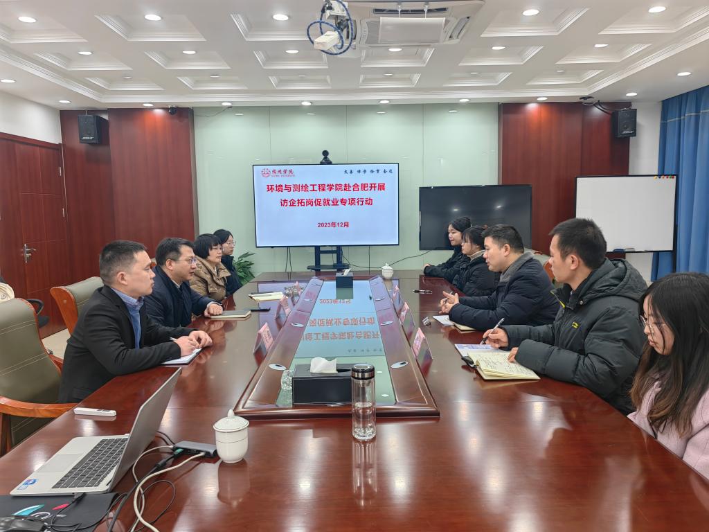 为进一步深化产教融合、校企合作,加大高校应用型人才的培养力度,12月26日上午,环境与测绘工程学院党委副书记、院长张海洋,环境工程专业实习指导教师卢维宏博士和裘浪博士一行,赴合肥市安徽禾美环保集团有限公司开展访企拓岗促就业专项行动并送实习生。安徽禾美环保集团有限公司副总裁汪小华、人事部长赵萍、办公室主任吴伟,安徽工和环境监测有限责任公司执行董事王珂、总经理丁中原、人力资源部副总监朱可可等热情接待了环测学院一行教师与学生。