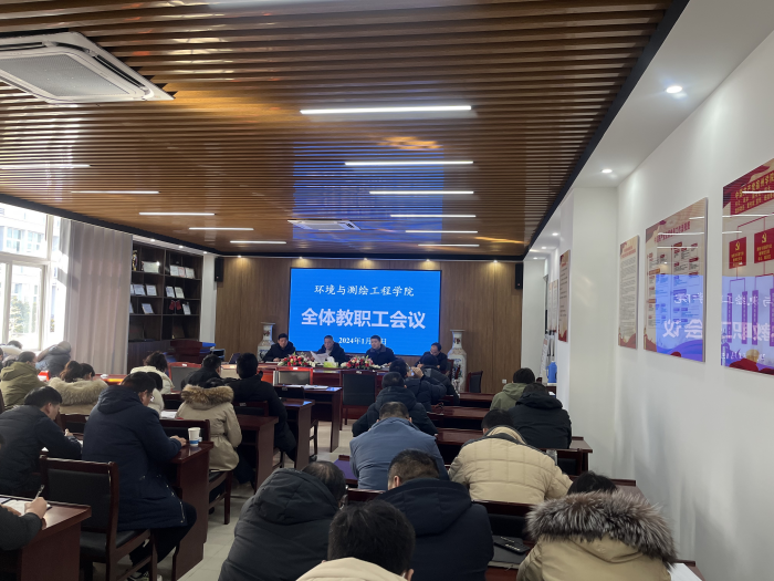 2024年1月15日上午,环测学院在工科楼A315召开全体教职工会议,学院党委书记胡冰,党委副书记、院长张海洋,党委副书记、纪委书记李建新,教学副院长徐国伟及全体教职工参加会议,会议由张海洋主持。