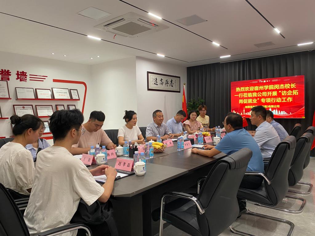 座谈会上,闵杰介绍了学校的基本情况和发展特色。他表示,近年来,宿州学院在人才培养、队伍建设、科技创新等方面越办越好。他希望以本次“访企拓岗”为契机与创图信息技术(安徽)有限公司在人才培养、科技合作、平台建设等方面进一步加强合作,实现公司为毕业生提供优质就业岗位,学校为企业发展输送优质人才的合作共赢。同时,他勉励今年新入职的四位毕业生在工作过程中要秉承“甘于吃亏,勇于吃苦”的心态,树立“大气方能成大器,有德不必求有得”的意志,努力成就自身价值。