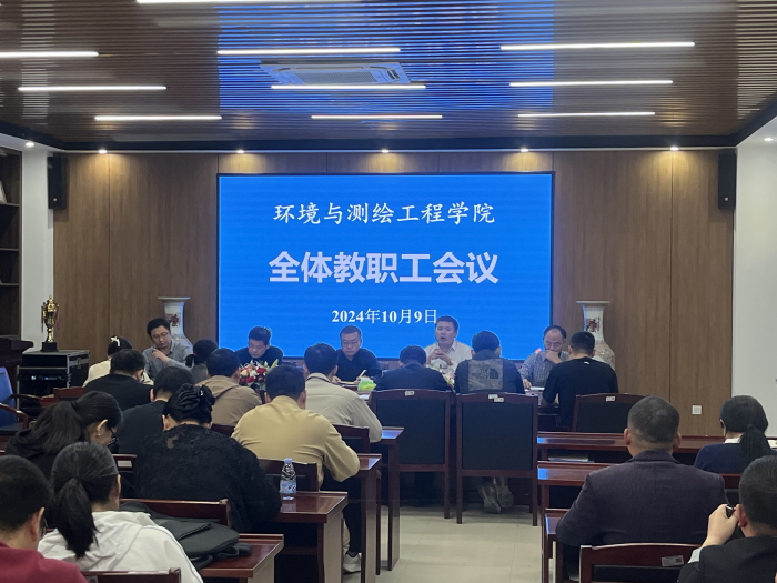 2024年10月9日下午,环测学院在工科楼A315召开全体教职工会议,学院党委书记蔡若愚,党委副书记、院长张海洋,党委副书记、纪委书记李建新,教学副院长徐国伟,科研副院长李琦及全体教职工参加会议,会议由张海洋主持。