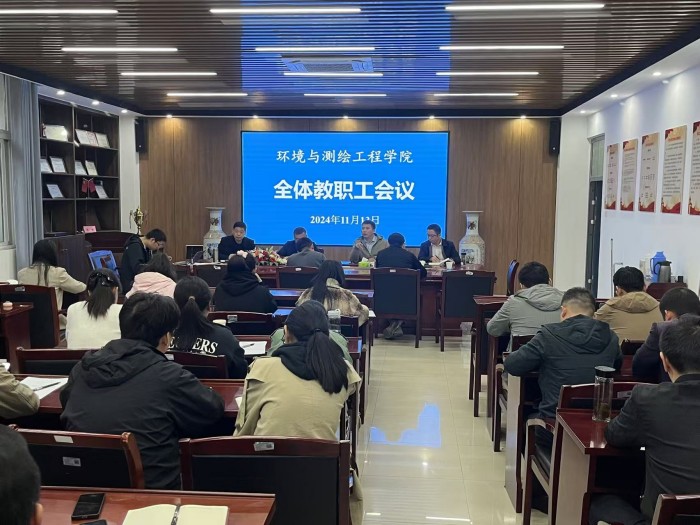 2024年11月13日下午,环测学院在工科楼A315召开全体教职工会议,学院党委书记蔡若愚,党委副书记、院长张海洋,党委副书记、纪委书记李建新,副院长李琦及全体教职工参加会议,会议由张海洋主持。