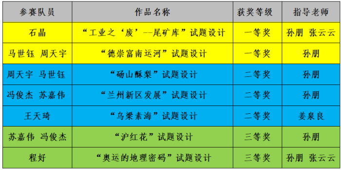 以赛促学,以学致用。我院积极组织地理科学专业学生参与此项大赛,经多轮师生的共同研讨,精心选题,用心构思,共提交作品7件。共荣获一等奖2项,二等奖2项,三等奖3项,指导老师孙朋、姜泉良、张云云获得优秀指导教师奖,具体获奖情况如下: