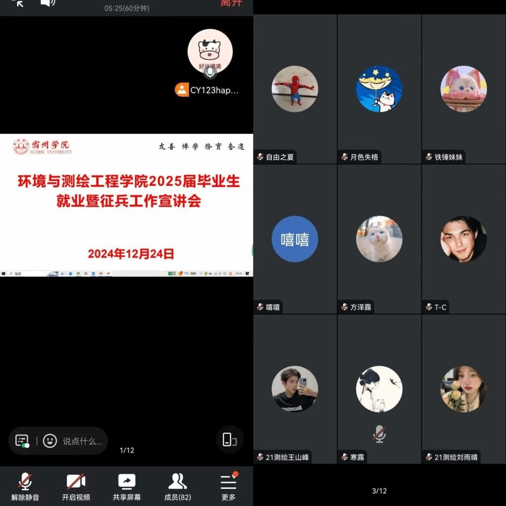 为扎实推进2025届毕业生就业和征兵工作,确保有就业意愿的学生早就业、就好业,确保有征兵意愿的学生实现征兵梦,12月24日,环测学院在工A315会议室通过线上与线下相结合的方式召开2025届毕业生就业暨征兵工作宣讲会,环测学院党委副书记、纪委书记李建新,学生事务管理科陈影,毕业班辅导员,环测学院征兵宣传大使毛基圳,学院2025届全体毕业生参会。