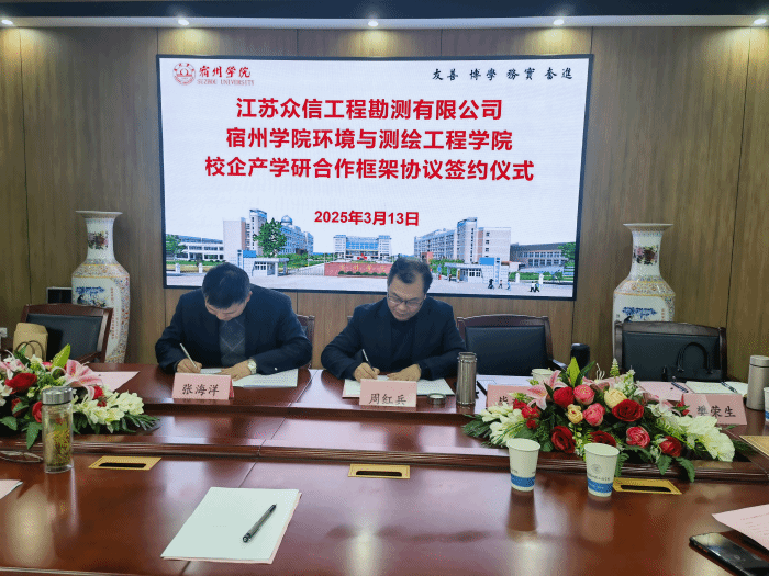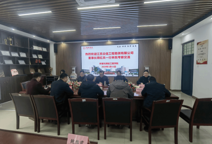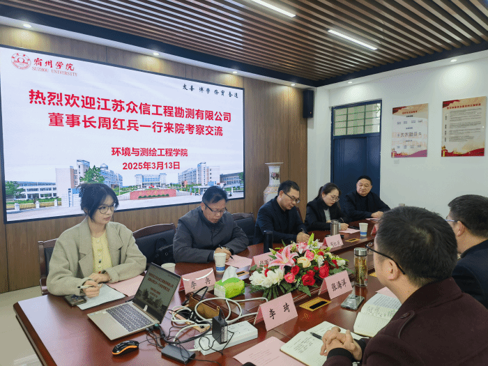 为深化产教融合,促进校企合作,3月13日,江苏众信工程勘测有限公司董事长周红兵,执行总经理毕秀娟,总工程师张百红,党支部书记樊荣生和综合办李冉一行到访宿州学院,参与“访企拓岗”交流活动,并签订校企合作框架协议。环境与测绘工程学院党委书记蔡若愚,环境与测绘工程学院党委副书记、院长张海洋,资源与土木工程学院党委副书记、纪委书记贾学彬,环境与测绘工程学院党委副书记、纪委书记李建新,环境与测绘工程学院副院长李琦等参与交流会。