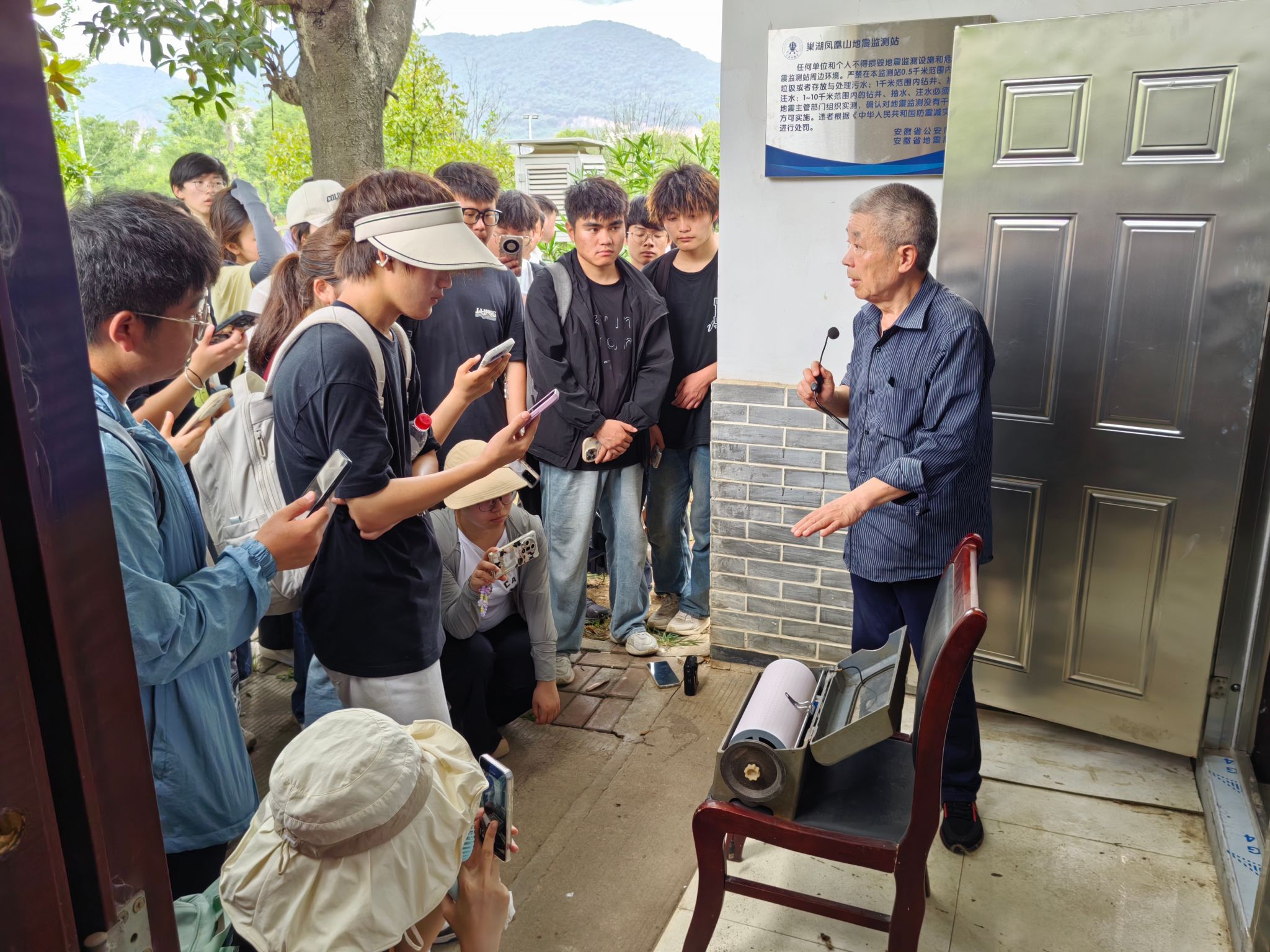 多维实践,锤炼专业能力,思政引领,厚植科学情怀。在为期五天的实习中,师生团队深入巢湖北山典型地质区域,通过实地观测、数据采集与案例分析,系统掌握区域地质演化规律。本次实习特别邀请安徽省地震局专家、皖14井地震监测站杨林根老师开展现场教学。杨林根连续五年义务为我校学生讲授地震监测技术与防灾科普知识,结合巢湖断裂带实例,生动阐释地震预警原理及应急避险技能。他扎根基层、坚守观测岗位40年无私奉献的科研精神深深感染了在场师生,成为一堂鲜活的“课程思政实践课”。