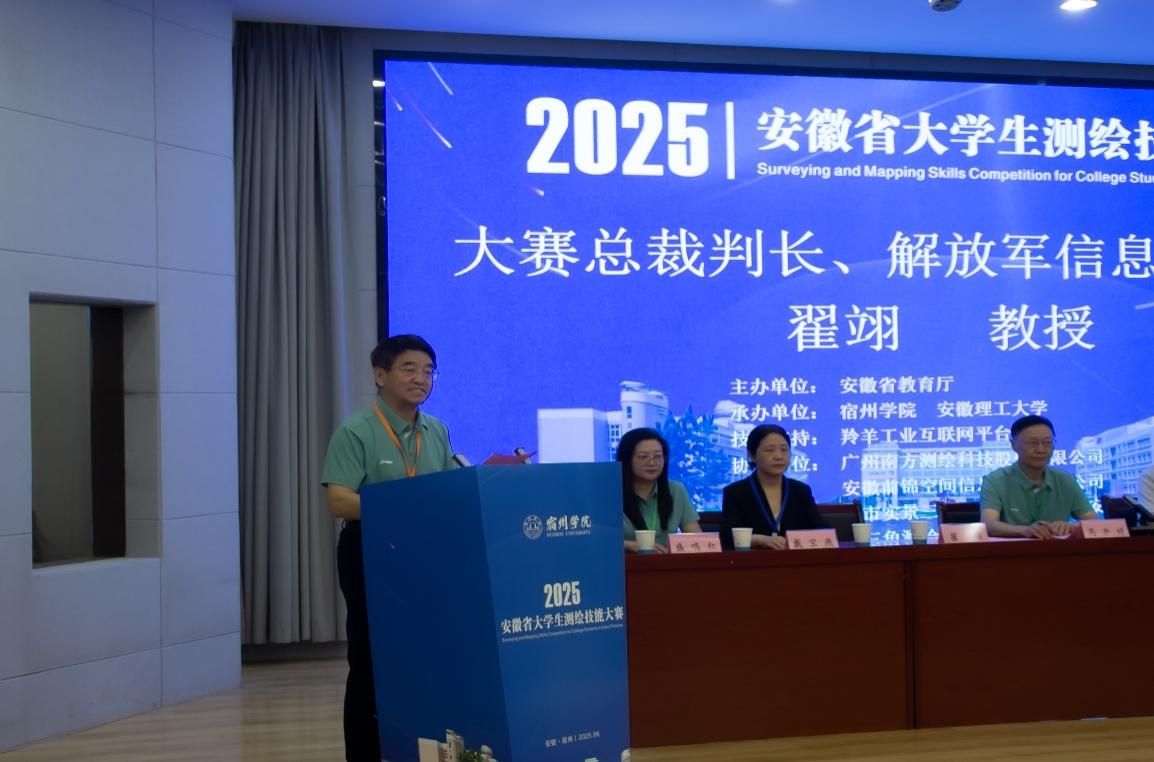 宿州学院党委副书记、校长闵杰教授致欢迎辞。他表示,测绘地理信息是国家经济建设和社会发展的重要基础,此次大赛是深入贯彻习近平总书记关于“深化教育教学改革,强化实践育人,培养创新型、应用型、技能型人才”重要指示精神的具体实践,也是提高学生创新实践能力、孕育创新成果的关键举措。作为承办方之一,宿州学院高度重视测绘工程专业建设,坚持“以赛促教、以赛促学、以赛促创”,培养了大批复合型人才,为测绘行业技术升级提供了重要人才支撑。同时,也希望发挥大赛的桥梁作用,进一步加强与各兄弟院校、行业企业的交流合作,共同推动测绘地理信息教育的创新发展。