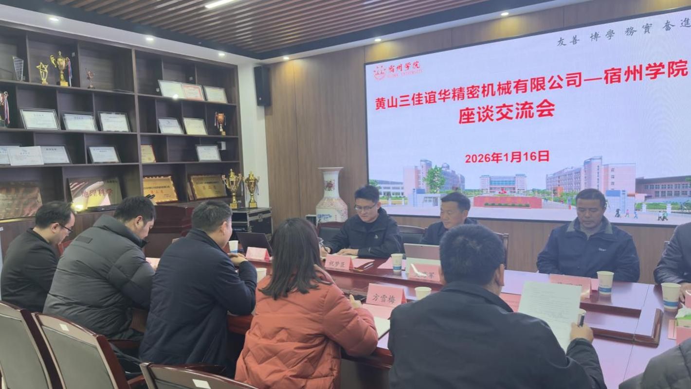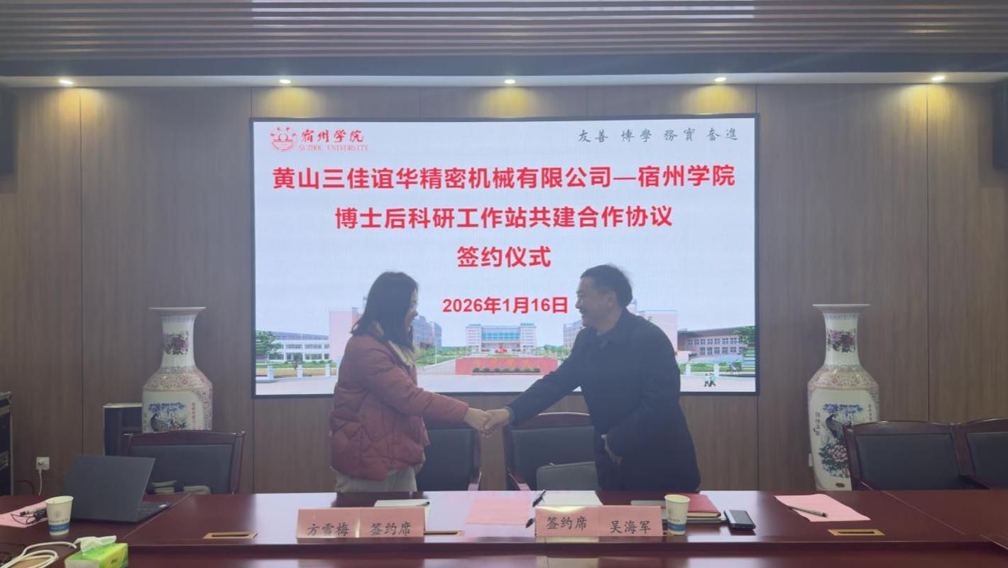 2026年1月16日下午,黄山三佳谊华精密机械有限公司总经理吴海军带队前往宿州学院,参观了国家级科研平台安徽省煤矿勘探工程技术研究中心,并与我校环境与测绘工程学院、资源与土木工程学院开展座谈交流。双方围绕技术攻关、人才培养、平台共建等方向展开深入探讨,并成功签订博士后科研工作站共建合作协议,标志着校企合作迈入实质性推进阶段。