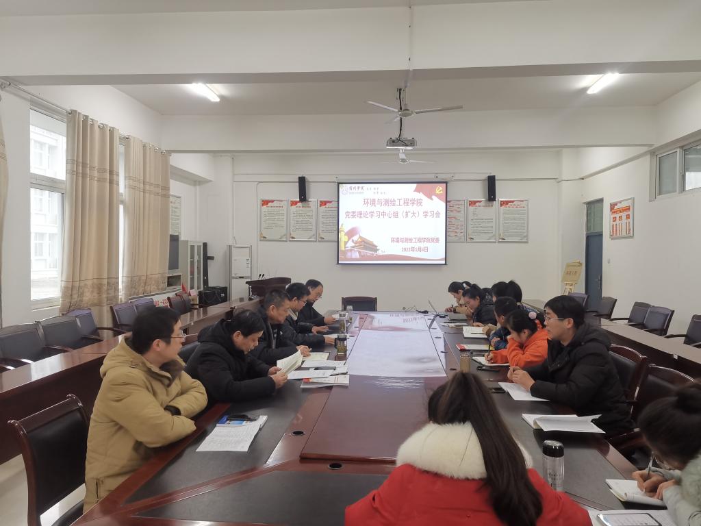 2022年1月6日下午,环测学院党委召开理论学习中心组(扩大)学习会议暨党史学习教育专题民主生活会会前学习会。会议学习了《习近平法治思想学习纲要》、《坚持用马克思主义及其中国化创新理论武装全党》、“中共中央政治局12月6日会议精神”学习;以及党史学习教育专题民主生活会会前学习会。学院科级及以上干部、各党支部书记、教研室主任和辅导员参加学习会,会议由学院党委副书记(临时负责)胡冰主持。