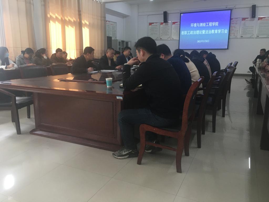 3月8日下午,环境与测绘工程学院党委在工A315会议室召开3月份全体教职工政治理论学习暨法治教育学习会,学院全体教职工参加会议。环测学院党委书记胡冰主持会议。