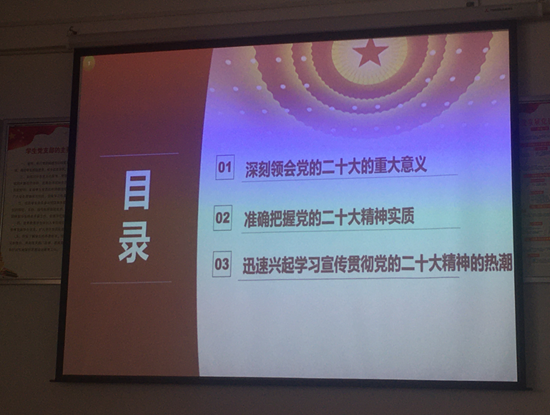 李玉才教授围绕“举旗帜 送理论”主题,从深刻领会党的二十大的重要意义、深刻把握党的二十大精神实质、迅速兴起学习宣传贯彻党的二十大精神热潮三个方面,用生动的语言、详实的数据、典型的事例,对党的二十大精神实质进行了系统阐述和深入解读。为我们解决了“为什么学”、“学什么”、“怎么学”三个方面的问题,让我们更加清楚地了解到党的二十大的丰硕成果,更加深刻地领会到党的二十大的重大政治意义、重大理论意义、重大现实意义、重大历史意义,从而坚定了我们的政治自觉、思想自觉、行动自觉、历史自觉。