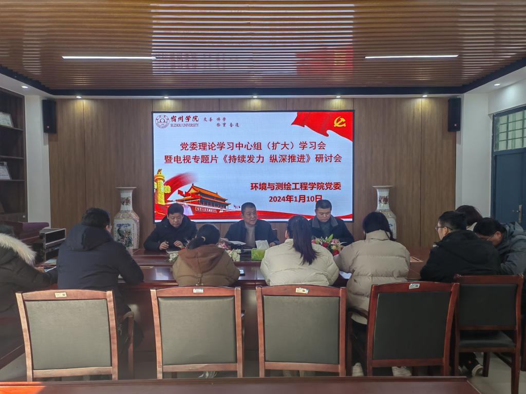 为深入贯彻党的二十大精神,2024年1月10日中午,环境与测绘工程学院在工A楼315会议室召开党委理论学习中心组(扩大)学习会暨电视专题片《持续发力 纵深推进》研讨会。会议由环测学院党委书记胡冰主持,党委委员、纪委委员、科级以上干部、支部书记参加会议。