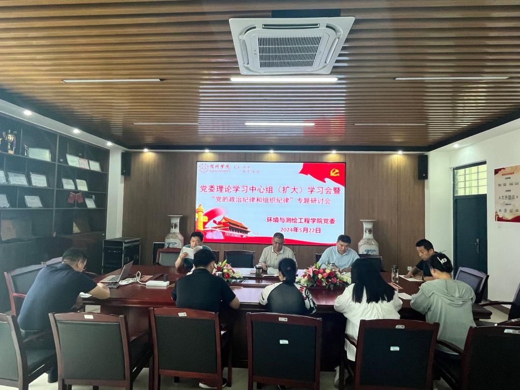 2024年5月22日下午,环境与测绘工程学院党委在工A315会议室召开党委理论学习中心组(扩大)学习会暨“党的政治纪律和组织纪律”专题研讨会。会议由环测学院党委书记胡冰主持,学院党委委员、科级以上干部、支部书记参加会议。