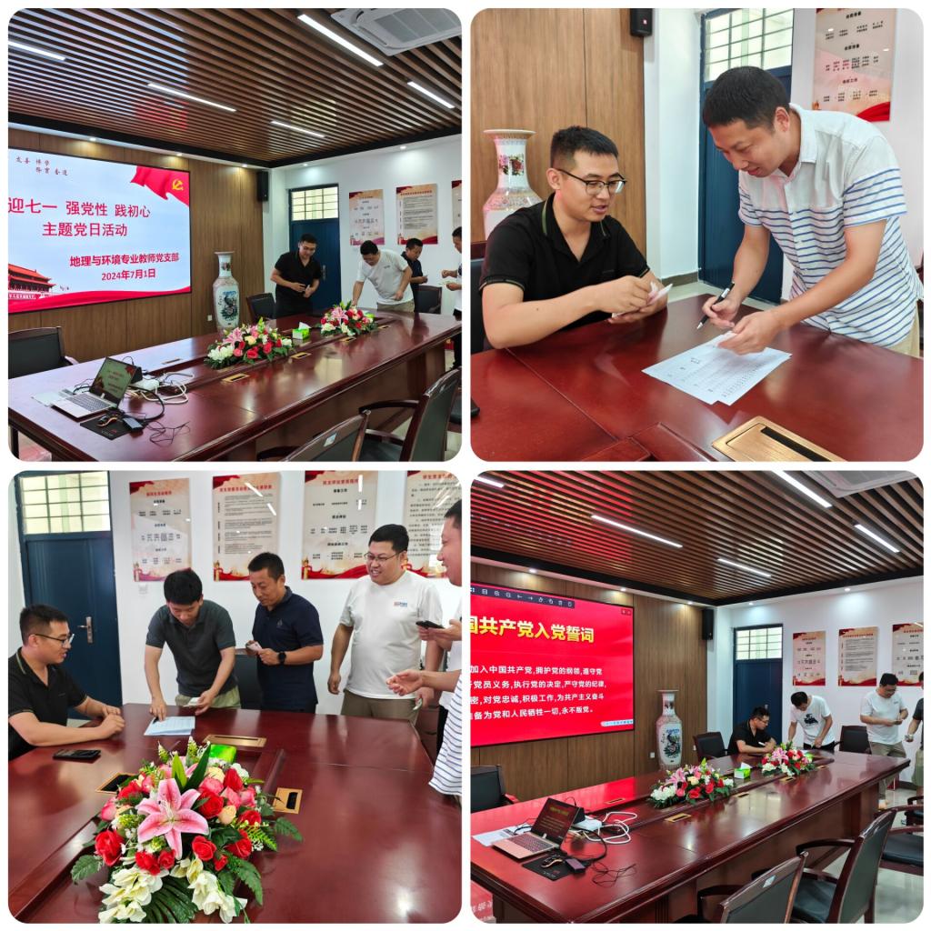 为庆祝中国共产党成立103周年,继承和发扬党的光荣传统和优良作风,进一步深入贯彻落实党纪学习教育,2024年7月1日下午,地理与环境专业教师党支部在工A315会议室组织开展“迎七一、强党性、践初心”主题党日活动。