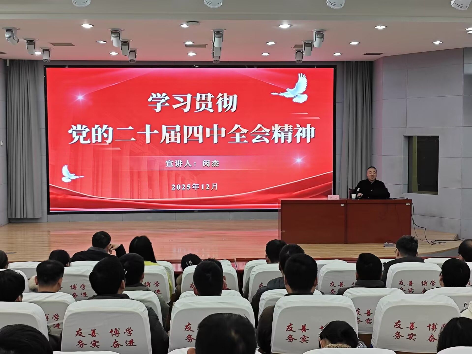 2025年12月3日下午,校党委副书记、校长闵杰在工科楼就业服务中心向师生宣讲党的二十届四中全会精神。环境与测绘工程学院全体教职工及第47期入党积极分子、数学与统计学院2024级数学与应用数学2班全体同学参加宣讲会。