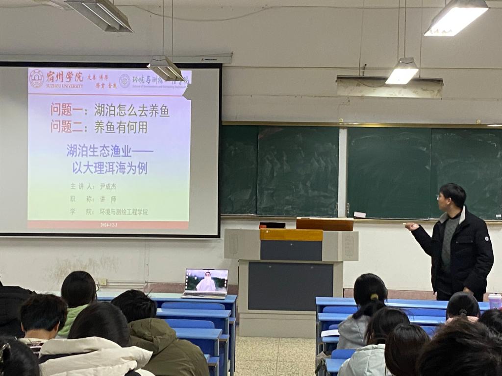 2024年12月8日晚19:00,宿州学院环境与测绘工程学院尹成杰博士在教学楼B108做题为“湖泊生态渔业——以大理洱海为例”的学术报告,环测学院2024级环境工程专业全体学生参加了此次学术讲座。