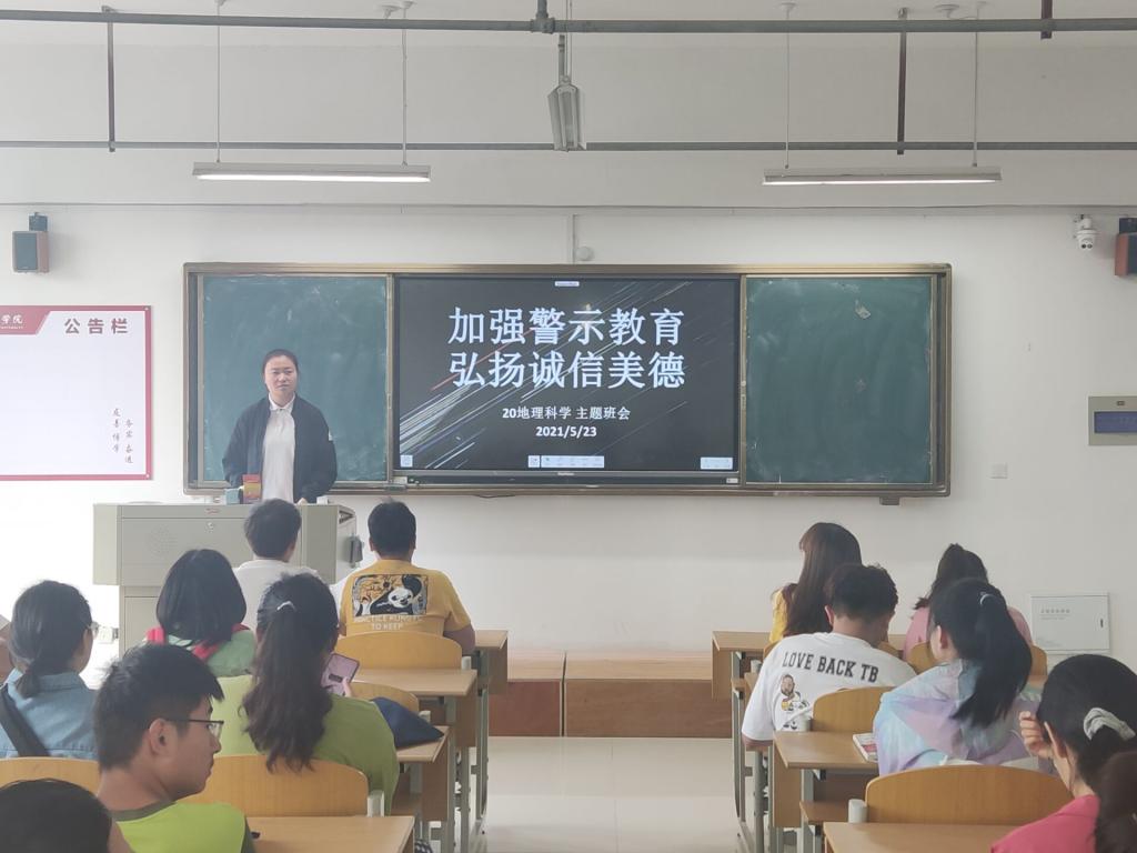 20地理科学于2021年5月23日星期一在实训楼A503举办了“加强警示教育,弘扬诚信美德”为主题的班会,20地理科学班全体同学参加此次活动。