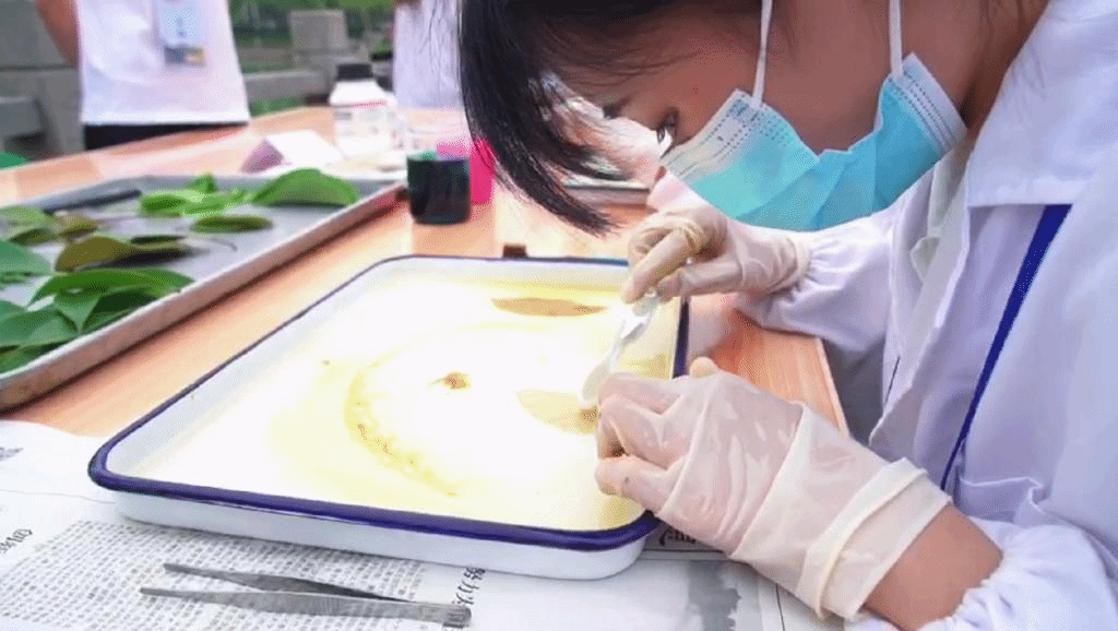 叶脉书签制作是除去表皮和叶肉组织,只由叶脉做成工艺品,通过刷叶、漂白、染色等工艺,启发同学们体会微小一叶中的大千世界。