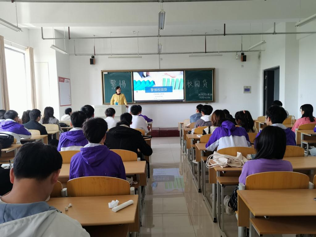 首先团支书张文静向同学们介绍了“校园贷”是大学生最容易陷入的金融陷阱。随着互联网的发展,网络借贷已经民间金融借贷的新型模式,更是打着“扶贫产业”“助学扶贫”的旗帜在学校滋生,学生只需要填写很简单的资料,就可以借到高额的贷款。张文静同学又介绍了“校园贷”的四个陷阱,“高额贷款服务费”“分期还款的高利贷”“高额担保费”以及“连环贷”。并展示了河南郑州某大学一位学生因借贷欠下近巨款,最终选择跳楼自杀。这个事例让同学们真实明白了“校园贷”的危害,给同学们敲响了一记警钟。随后,杨乐同学向大家分享了如何拒绝校园贷的方法,花钱要在自己能力之内,在父母能力之内,不要超出自己的额度。并且要生活中除了会省钱,还要学会理财,给自己的未来铺一条正确的路。最后,殷老师又向学生介绍了许许多多我们身边的“校园贷”模式,让同学们认识到“校园贷”就在我们身边,提高了大家对“校园贷”的警惕性。