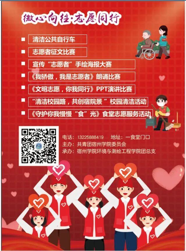 本次志愿者活动分为志愿者征文比赛、《我骄傲,我是志愿者》朗诵比赛、《文明志愿,你我同行》PPT演讲比赛、宣传“志愿者”手绘海报大赛、清洗公共自行车、“清洁校园路,共创宿院景”校园清洁活动、《守护我慢慢“食”光食堂志愿活动》七个活动项目,致力于让我校学生锻炼自己,不断提高自己的社会责任感和实践能力。
