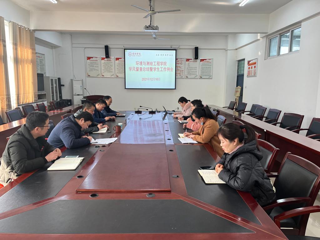 12月10日上午,环测学院在工科楼A315会议室召开学风督查总结暨2021年12月第2次学生工作例会。会议由党委副书记(临时负责)胡冰主持,党委副书记、院长张海洋,党委副书记、纪委书记李建新,教学副院长徐国伟,科研副院长李琦及全体辅导员、班主任参加。