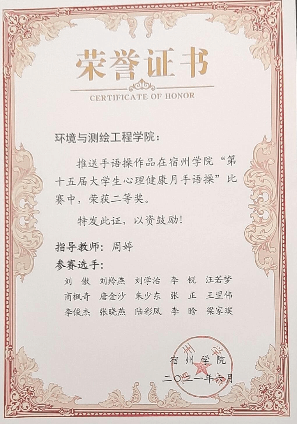 在活动举办过程中我院大一新生积极组队参加比赛,积极利用课余时间积极认真比赛项目。在选拔赛现场各个队伍编排合理,进出场迅速、整齐,服装统一整洁,手语动作准确到位,表现形式灵活多样,表演感情到位,现场观看的同学也为之感染。最终院艺术团凭借着优秀的团体表现成功进入校赛并取得了校级二等奖的优秀成绩。