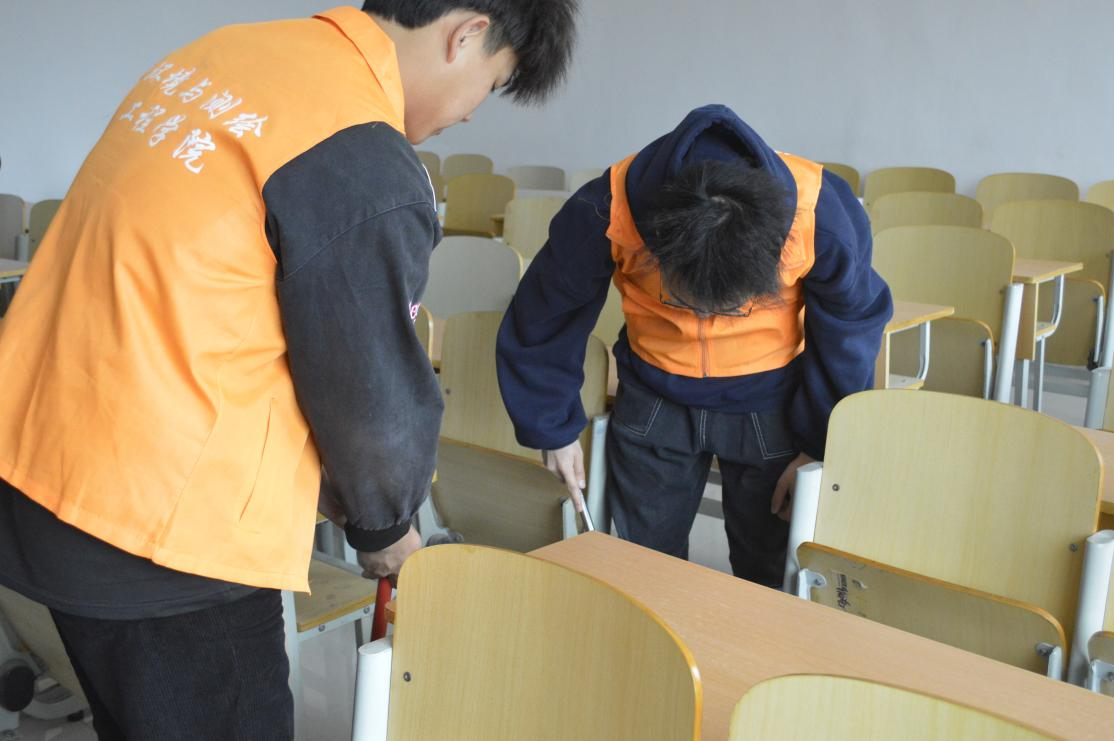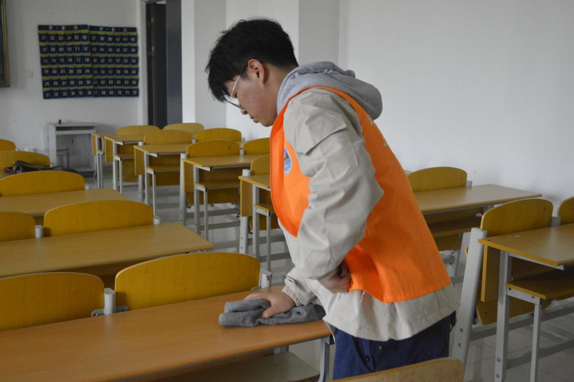 3月16日中午,参加本次活动的同学们在工作人员的带领下前往实训A楼开展本次活动。活动过程中,同学们利用自己带来抹布和扫帚对于学院教室进行了认真清扫,并仔细清理的教室角落以及抽屉里面的残留垃圾。