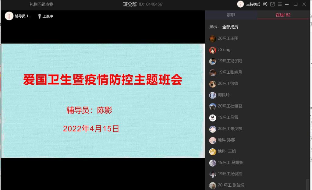 春季是传染病多发和传播较强的季节,为进一步帮助学生提高健康安全意识,2022年4月15日,环测学院各班级通过线上线下相结合的方式组织召开“爱国卫生暨疫情防控”主题班会,班会由辅导员组织,全体学生参加。