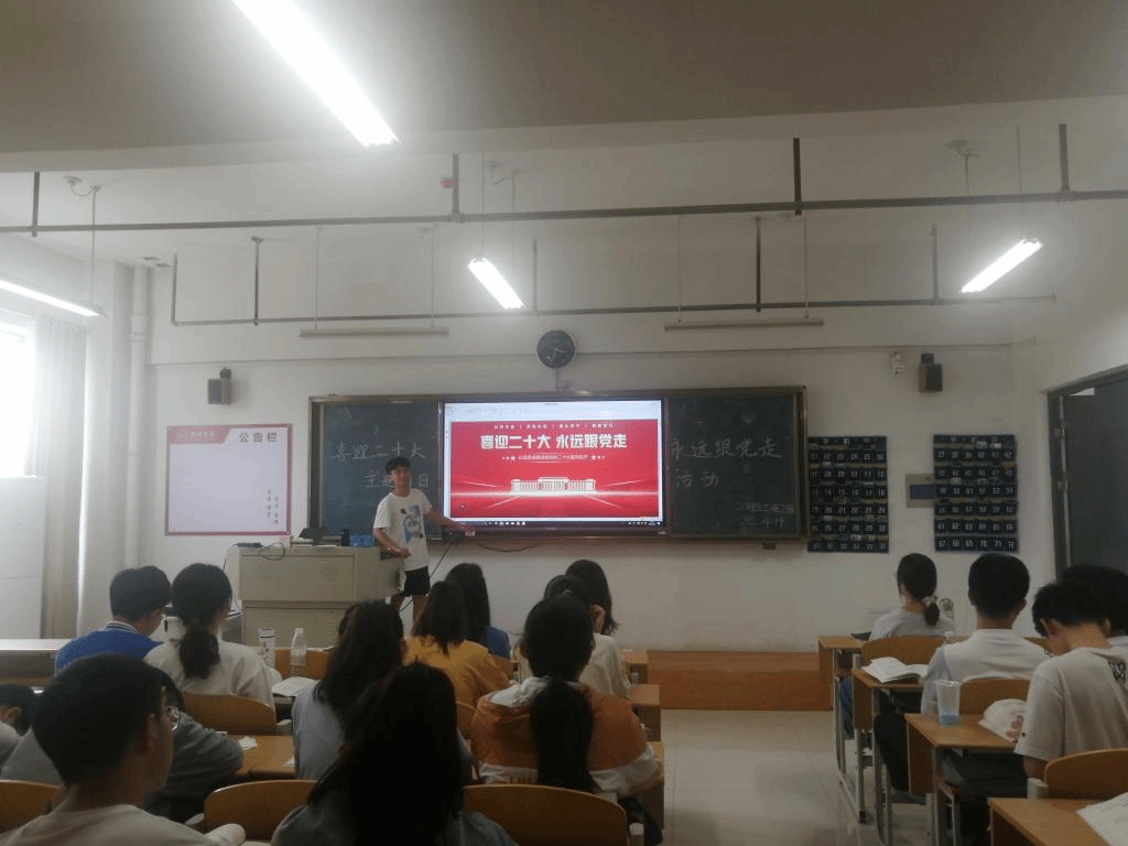 本次活动由团支书张利伟主持进行。团支书首先以PPT讲解的形式带领我们共同学习了“中国共产党第二十次全国代表大会简介”,接着播放了《觉醒年代》、《人间正道是沧桑》、《人世间》等红色影视作品的精彩片段,让我们通过感性体验来深刻认识红色政权来之不易、新中国来之不易、中国特色社会主义来之不易。接着,在文娱委员王翌玮的带领下,我们共同唱响了团歌《光荣啊!中国共青团》。沉浸式地了解了团歌的历史背景和创作故事,感受百年团史的光辉历程。本次活动在嘹亮的歌声中圆满结束。
