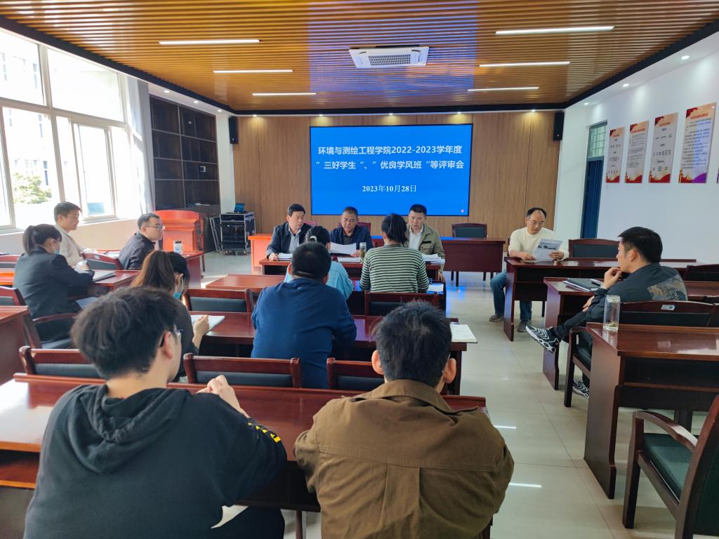 为做好评奖评优工作,10月28日上午,环测学院在工A315会议室召开2022-2023学年度“三好学生”、“三好学生标兵”、“优良学风班”、“文明宿舍”评审会。学院党委书记胡冰,党委副书记、院长张海洋,党委副书记、纪委书记李建新,教学副院长徐国伟,辅导员,教师代表,学生代表参加会议。
