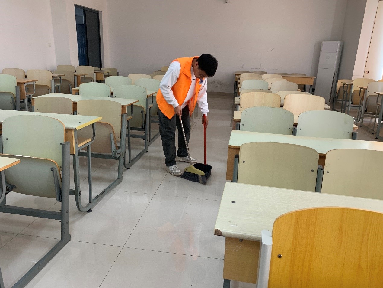 学生党员在实训楼开展教室清扫活动,仔细清扫教室角落的灰尘与垃圾,认真擦拭黑板与桌面,为营造良好的学习氛围,创建文明卫生校园环境贡献出属于自己的一份力量。