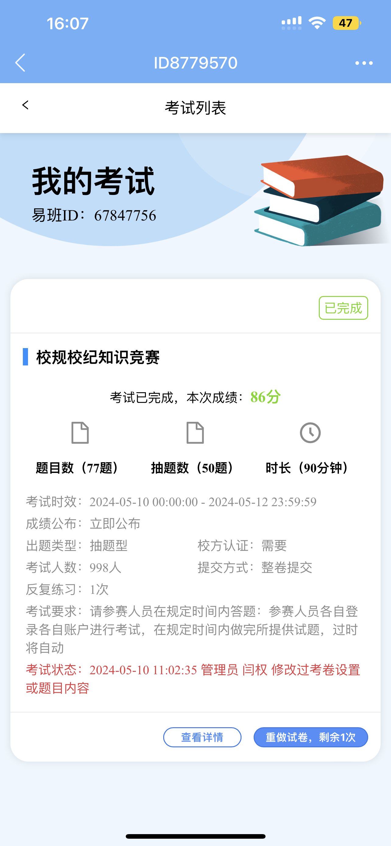 二是参加校规校纪知识竞赛。各班级鼓励学生在易班APP上积极参加校规校纪知识竞赛。通过知识竞赛,进一步加强了学生对规章制度的理解和应用能力。
