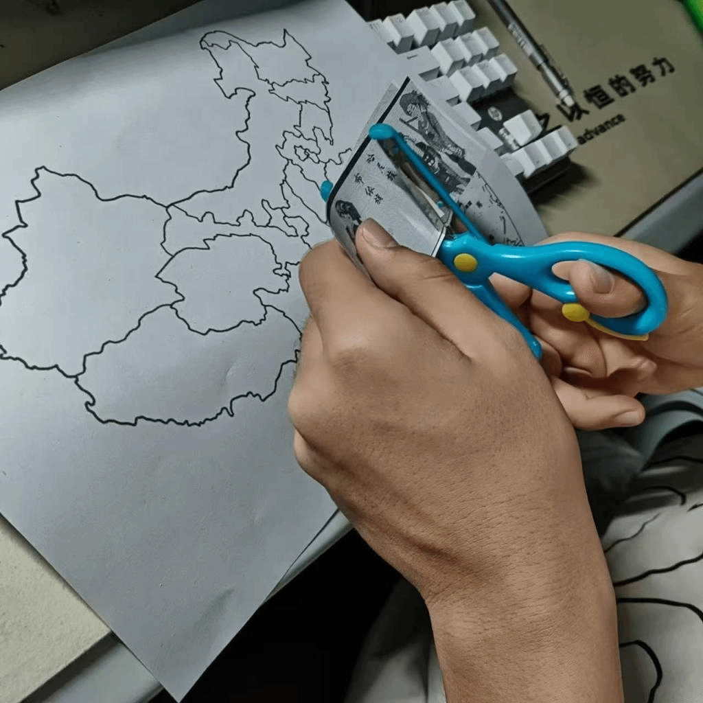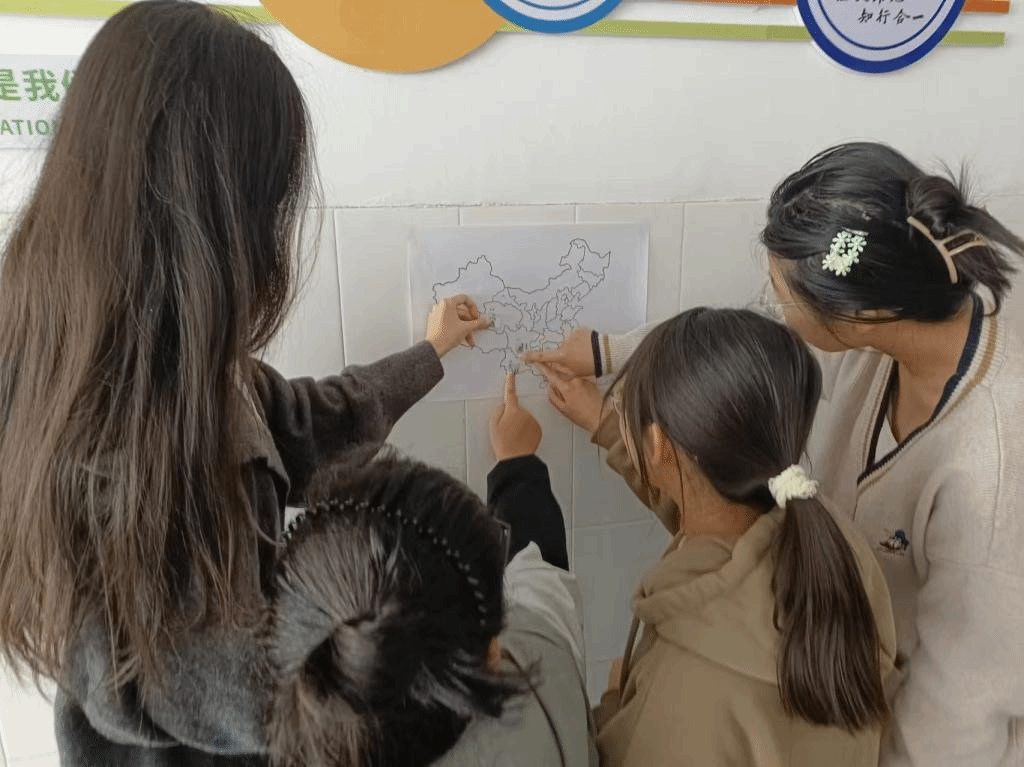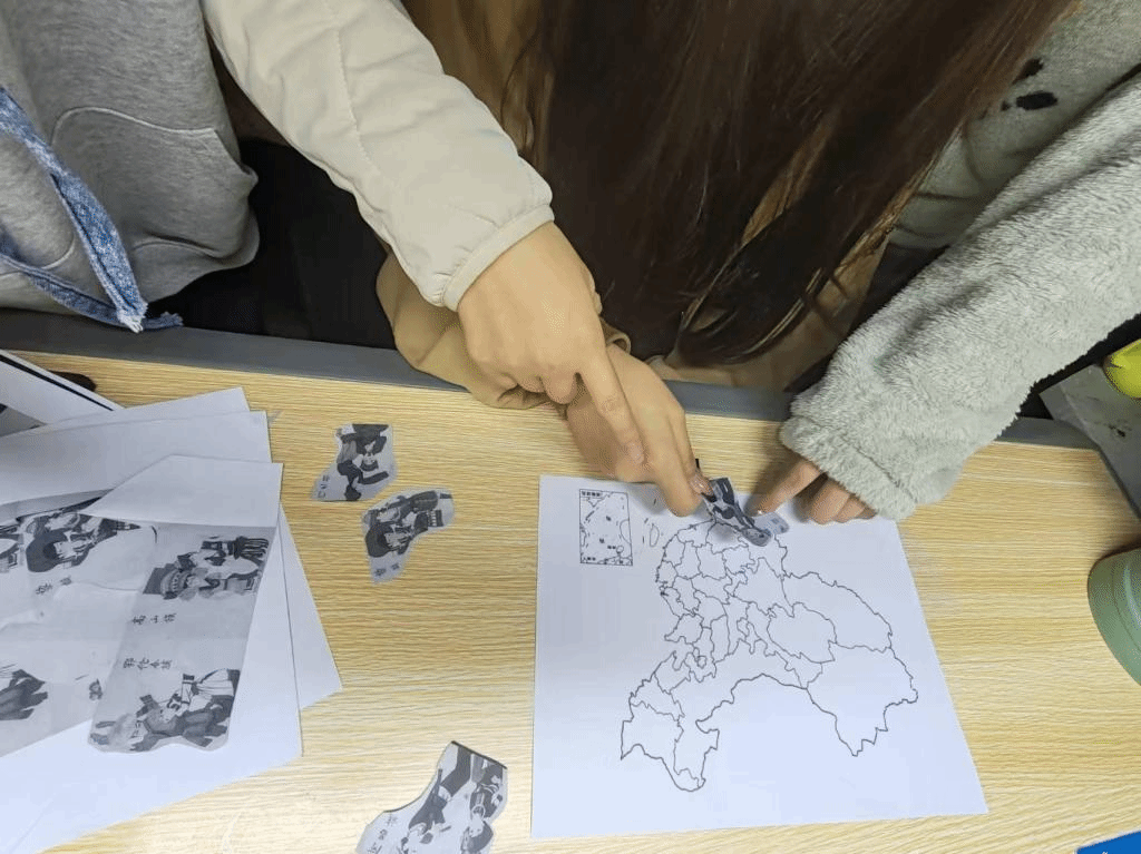 第二组选取了藏族等图片,他们细致地剪下藏族人物图案,轻轻贴在西藏自治区的位置上。过程中,小组成员不仅交流了藏族的风土人情和文化特色,还深刻体会到藏族作为中华民族大家庭中不可或缺的一员所承载的历史与文化价值。拍摄的过程图和成果图记录下了他们专注与认真的瞬间,表达了对藏族文化的敬畏之心和民族团结的坚定信念。