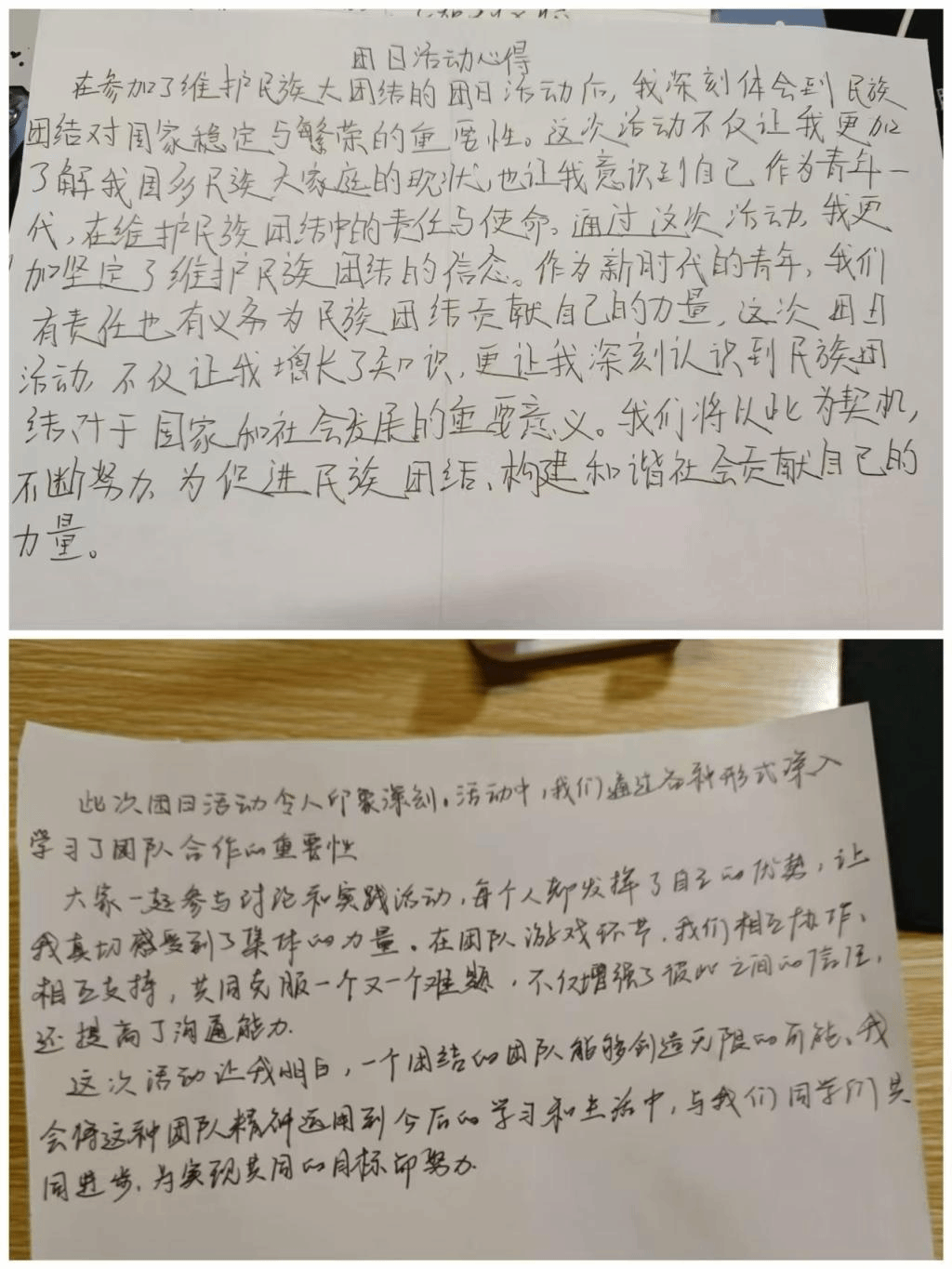 活动结束后,每组都提交了拍摄的过程图、成果图以及手写心得。通过这次活动,同学们不仅加深了对各民族文化的了解,更增强了民族团结意识和爱国情怀。大家纷纷表示作为新时代的青年学子,我们要时刻保持对民族团结的敬畏之心,用实际行动践行“民族大团结,共画同心圆”的庄严承诺,共同书写中华民族伟大复兴的新篇章。