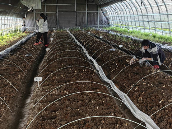 团队指导老师卢维宏带队,在宿州市埇桥区中心农业农民专业合作社的种植基地采集农田土壤样品、进行测土分析。针对土壤生态健康问题,实践团将新型生物碳基复合肥料这一前期科研成果在葡萄等果蔬作物上示范应用,促进玉米秸秆快速分解,将秸秆转化为宝贵的资源。有效提高土壤有机质,优化土壤生态环境,提升农产品产量和品质。对于需要高肥力土壤的葡萄和羊肚菌等高附加值作物来说,提供了更优质的生长环境。服务过程中,团队成员还调查大棚羊肚菌病变问题,运用专业知识分析病变因子成因,为当地土壤改良和农民增产积极出力。成员们纷纷表示,将继续在乡村大地上挥洒汗水,为农业的绿色发展和农村的生态振兴贡献自己的力量。