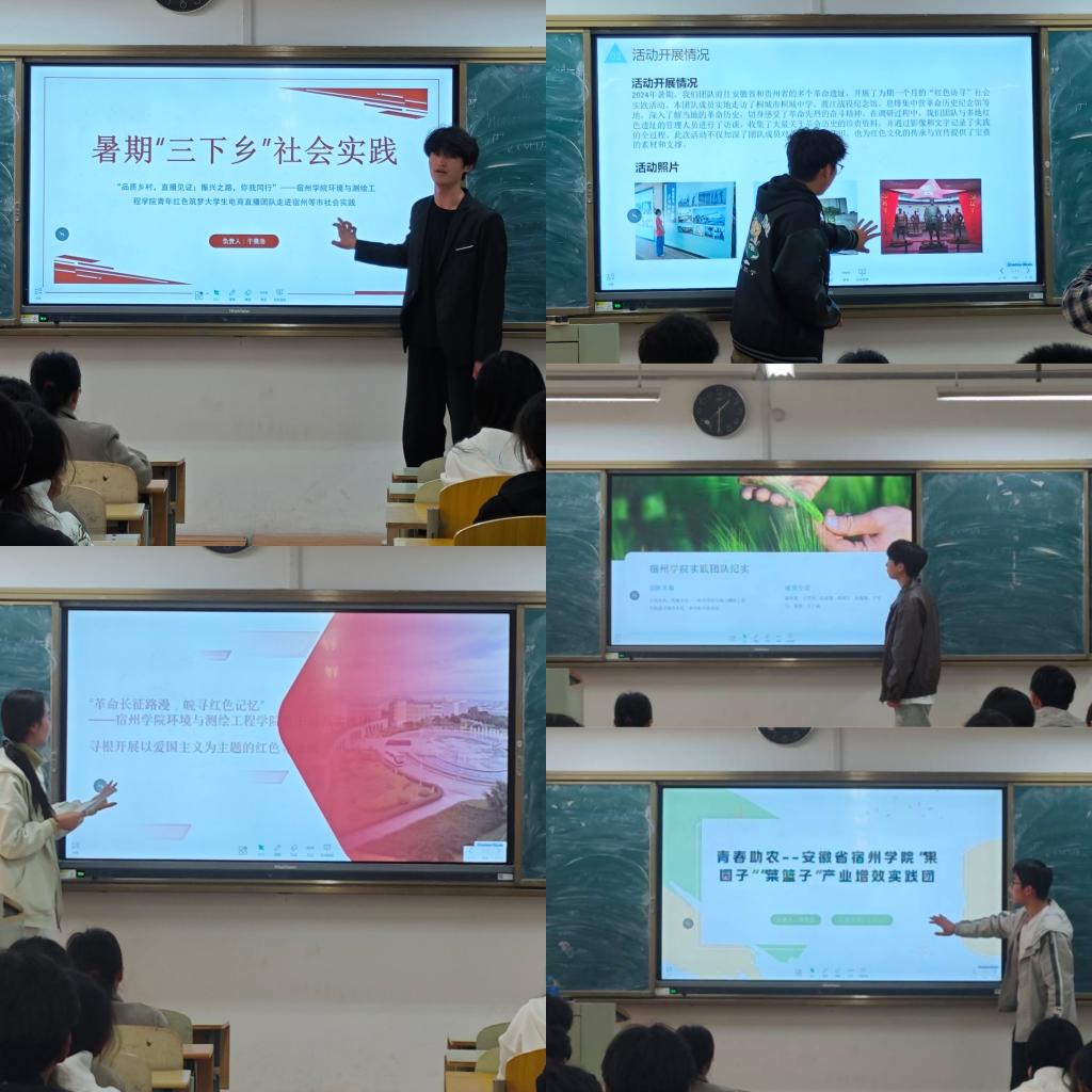 在展示环节中,团队成员通过精心准备的PPT和图片展示了各自的实践成果,内容涵盖了助力乡村振兴、传承红色精神、推动农业增效等多个主题。“青年红色筑梦大学生电商直播团队”分享了他们在宿州及周边城市开展的电商助农活动,通过直播推介当地特色农产品,帮助农民拓宽销售渠道,带动农产品销量,为乡村经济发展贡献青春力量;“果园子·菜篮子”产业增效实践团深入调研了宿州市特色果蔬产业,从技术支持到品牌推广,提出了一系列提升产业价值的方案,并现场展示了实践成果;“访寻根”团队以爱国主义为主题,走访红色遗址,讲述历史人物故事,旨在弘扬革命精神,为当代青年树立榜样,同时推动当地红色旅游的发展。每个团队的展示内容详实,结合现场照片和数据,展现了团队成员在社会实践中的踏实作风和创新能力。