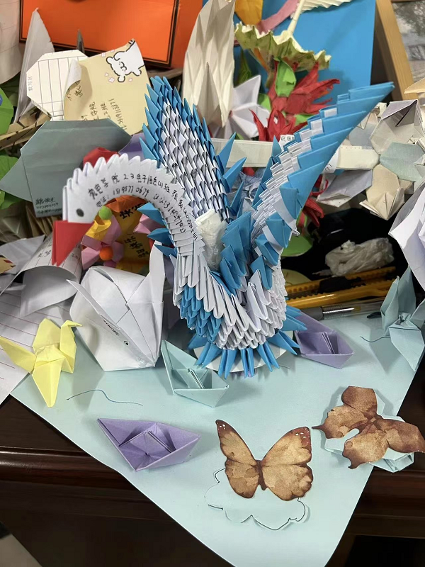 “放飞心灵,巧折万物”创意折纸活动不仅为学生们提供了一个展示自我、释放压力的平台,更通过手工制作的过程,促进了学生们的心理健康发展。活动让学生们在轻松愉快的氛围中,学会了如何运用创意和艺术来表达自己的情感,增强了自我认知和自我调节的能力。同时,活动也进一步推动了环测院心理健康教育的深入开展,为构建积极健康的校园心理环境做出了积极贡献。
