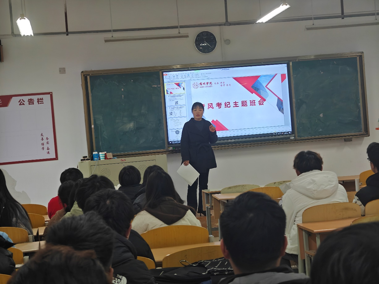 为严肃考风考纪,营造诚信考试氛围,2024 年12月19日,24 届测绘二班在实训楼A501举行了一场关于考风考纪教育的主题班会,班会由辅导员殷瑾老师主持。